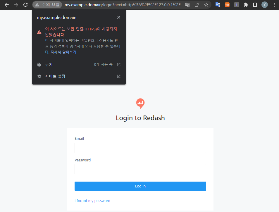 - 정상적인 접근 화면은 확인할 수 없지만 Nginx를 통해 80번 포트로의 접근을 443포트로 보내주는 설정 등을 실습하여 안전한 대시보드 환경을 만들어보도록 하자!