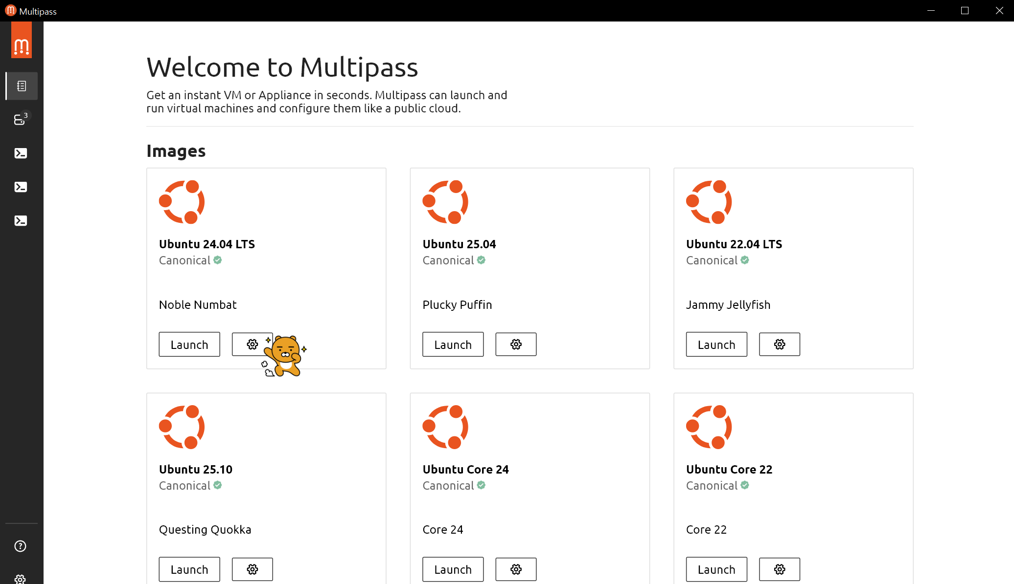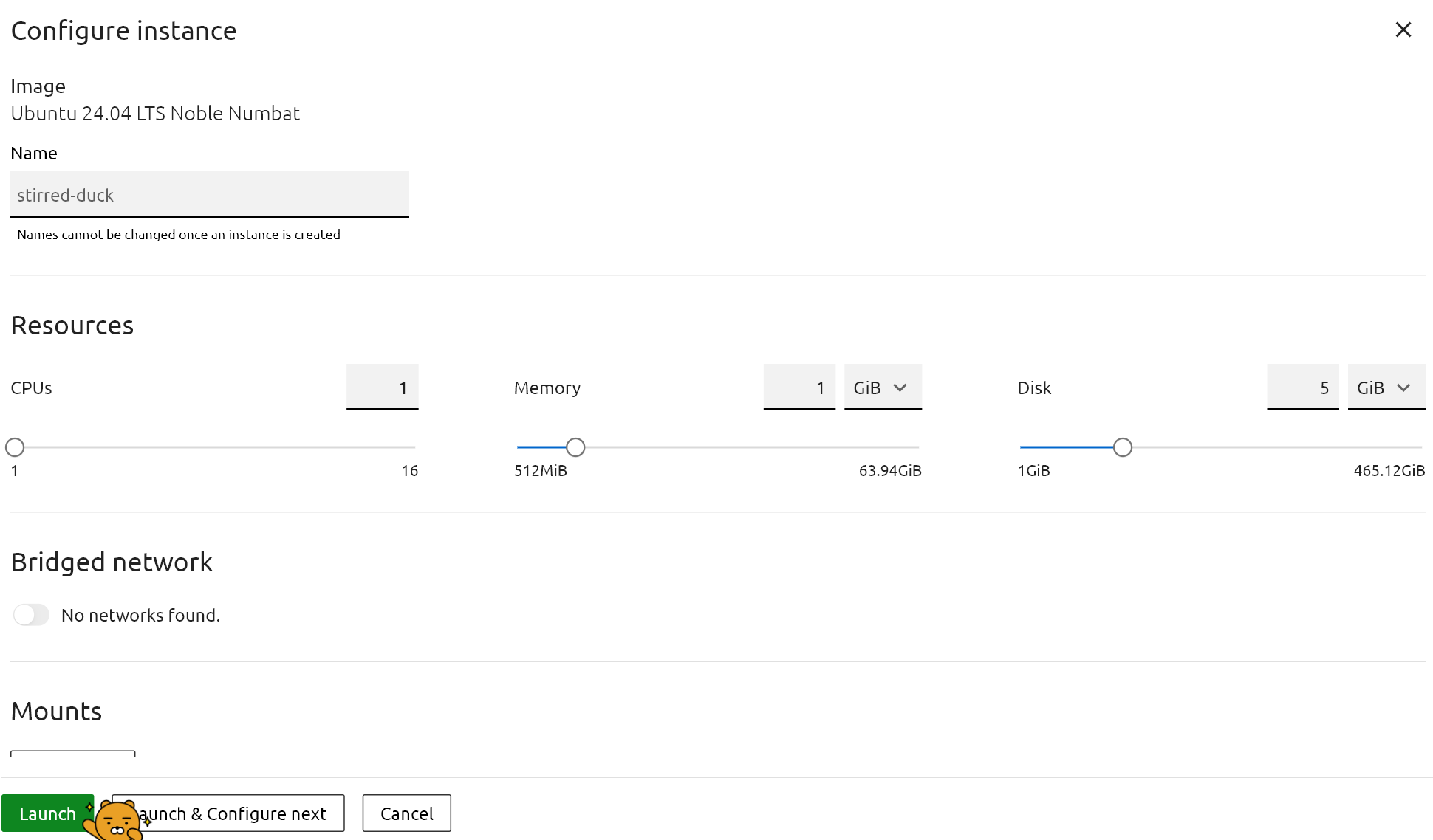 - 톱니바퀴 모양을 누르면 VM의 이름, CPU, RAM, DISK를 설정해서 Launch 할 수 있다.